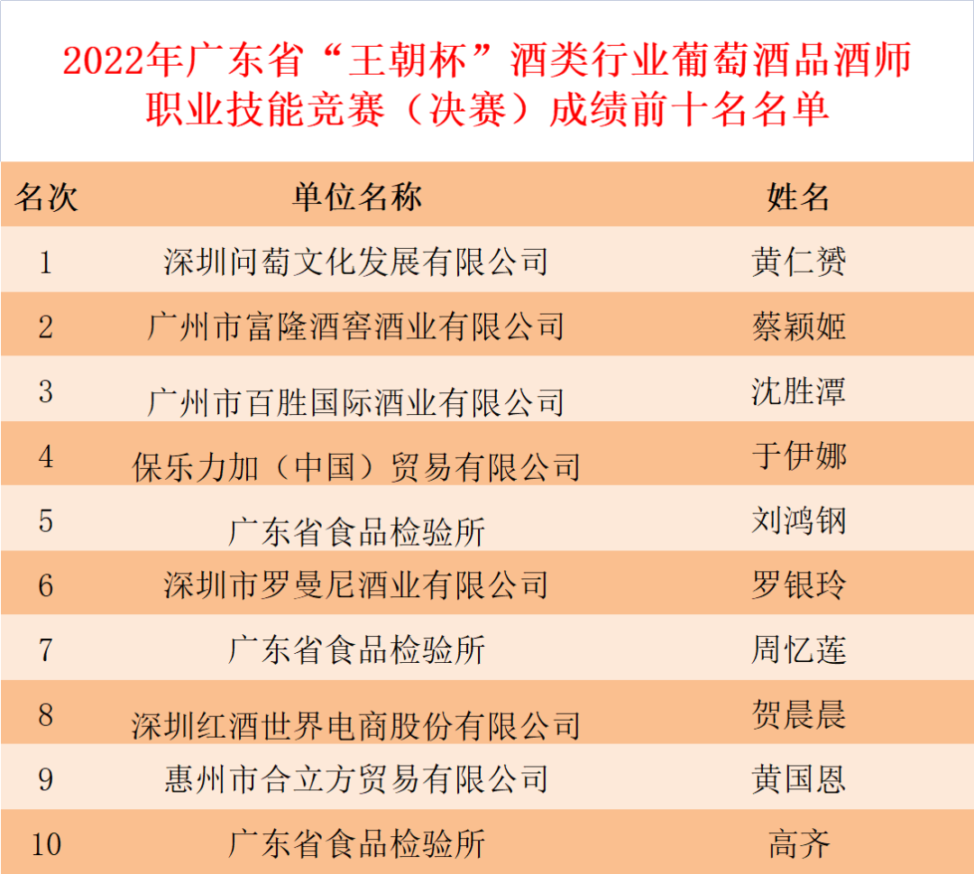 “2022 年广东省“王朝杯”酒类行业葡萄酒品酒师职业技能竞赛(决赛)”,经过两天的激烈角逐终于圆满结束,顺利完成了预定的各项赛事,赛出了风格、赛出了水平,赛出了团结,赛出了友谊,达到了鼓干劲、聚人心、促和谐的预期目标。展现了广东酒类行业葡萄酒品酒师队伍的精神风貌,为建设一支高素质的酒类行业葡萄酒品酒师队伍,奠定了良好的基础。在此向决赛赞助企业 天津王朝酒业销售有限公司 及赛务组全体工作人员表示衷心的感谢,并感谢会员单位:一号云仓对大赛用水和会务工作的大力支持。