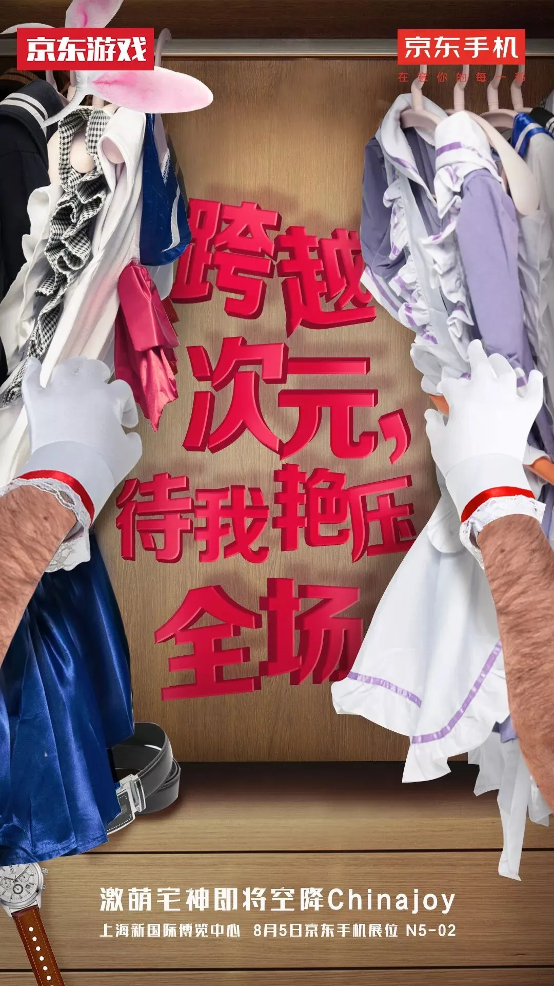 京东手机今天放出了一张悬疑海报,画面中一双粗壮的手臂正在二次元气息满满的衣柜中挑选Cos服,宣告激萌宅神即将盛装Cos空降京东手机ChinaJoy会场!是女装大佬还是健壮女汉?相信不管是哪种,这位大神的现场Cos肯定能让我们留下难以磨灭的深(xin)刻(li)印(yin)象(ying)。