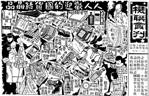 有许多广告把数量众多的“国货”集合在单张页面上,这里收集的这则广告是其中一张。上海机联会发明了这种广告形式,在20世纪20年代末到30年代,他们把这种广告刊登于中国主要的报纸上。如同国货商店的情况一样,这种广告形式创造出一种纯粹的民族主义商品景观,因为这张广告页面内的任何一件物品都是经过检验的国货。这类广告使小规模的中国公司能够发布广告,并证明中国生产了一大批“人人欢迎”的商品。