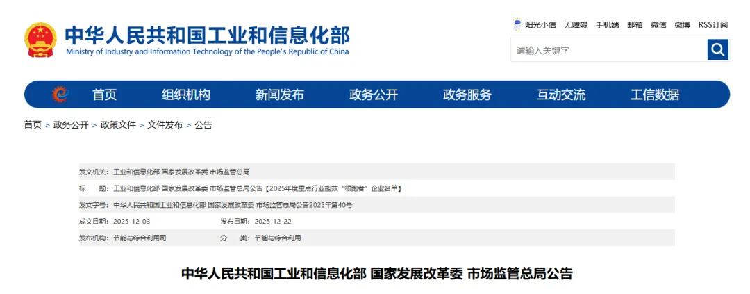关于2025年度重点行业能效“领跑者”企业名单的公告