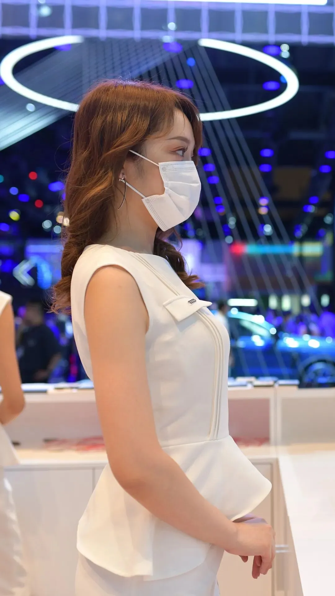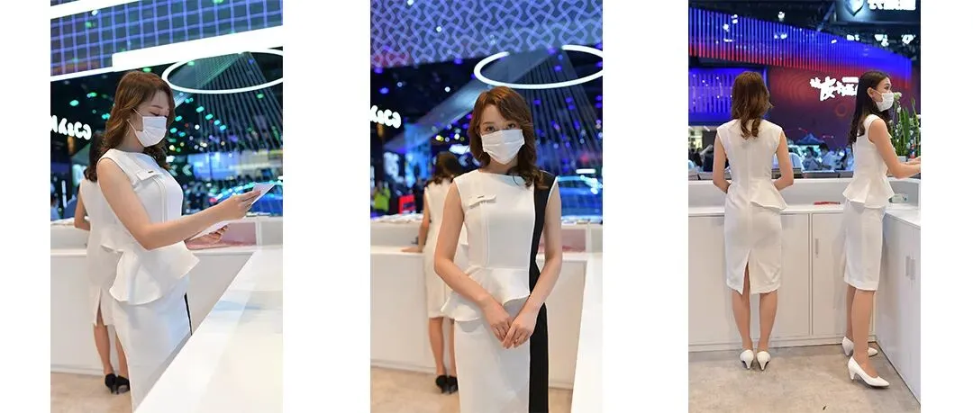 白色穿搭,白色象征着干净、纯粹,给人一种专业且可信赖的感觉。无袖上衣的设计,在炎热的展会环境中能带来一丝清凉,同时展现出女性的柔美线条。中长裙长度适中,既不过于保守,又不失端庄,方便在展会中自由走动、与他人交流。白色高跟鞋则进一步提升了整体的气质,使身姿更加挺拔。