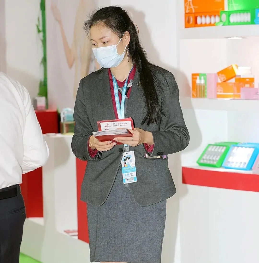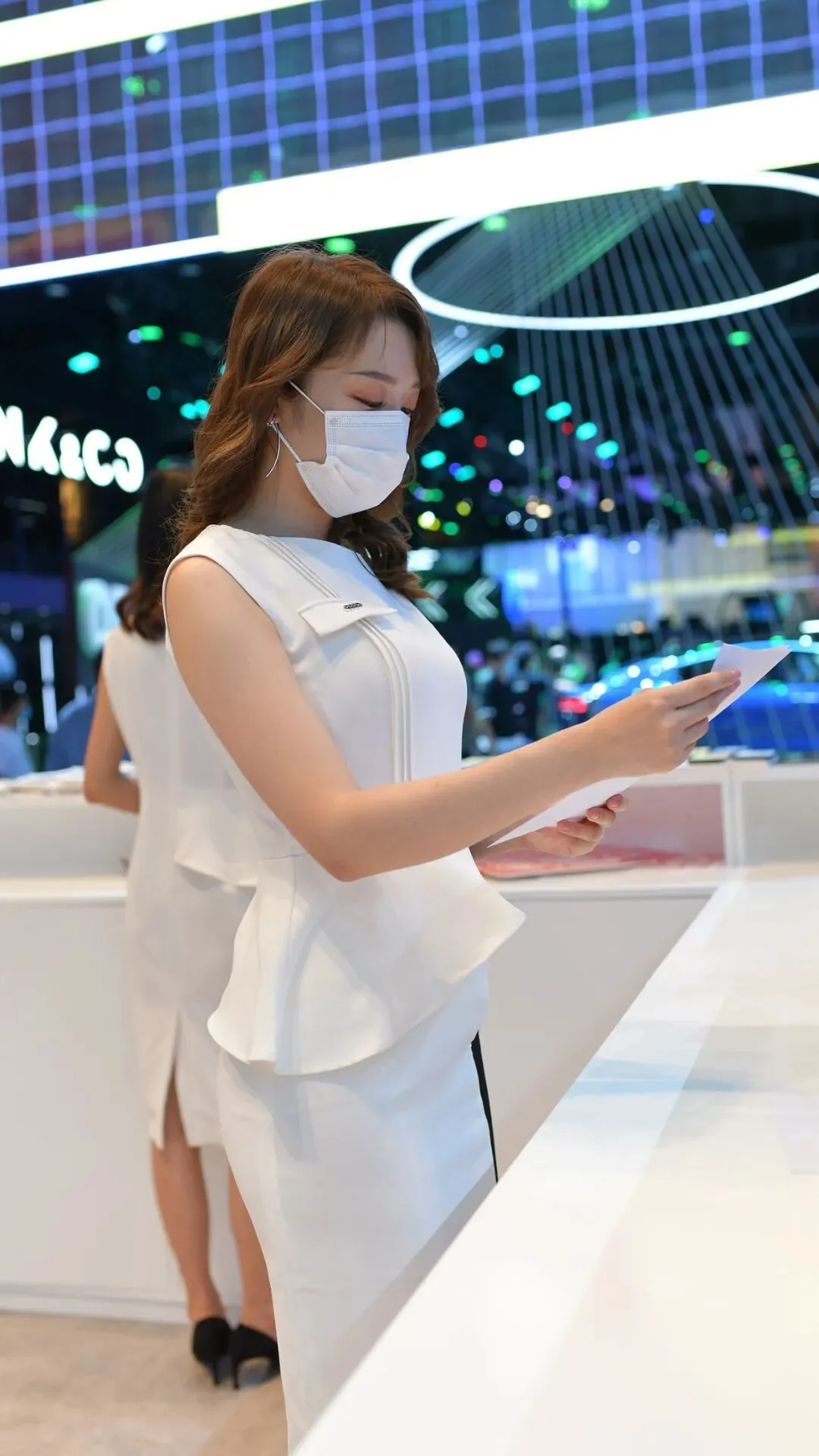 她静静地站在展台旁,手中拿着纸张,眼神专注而认真。那身白色的职业装剪裁得体,衬托出她优雅的气质,口罩虽然遮住了她的半张脸,但从她专注的眼神中,依然能感受到她的专业与敬业。