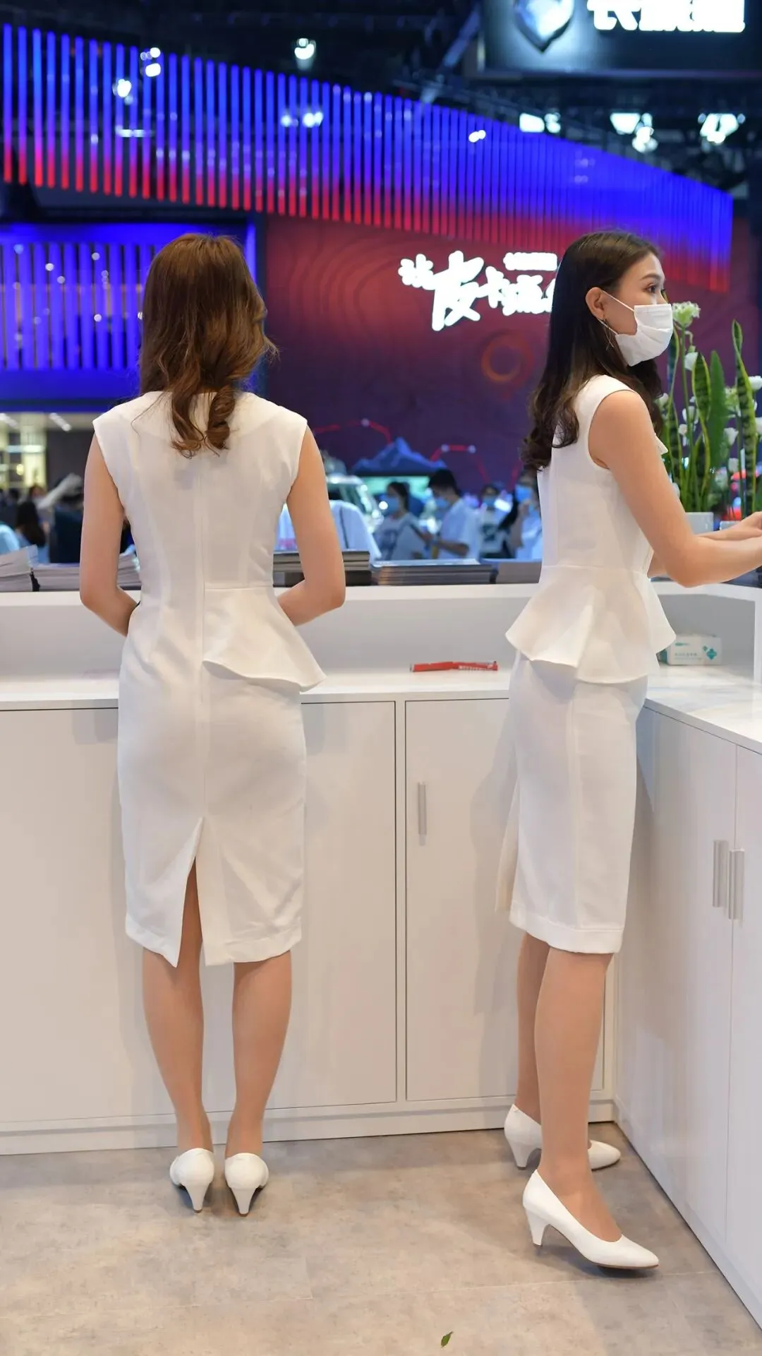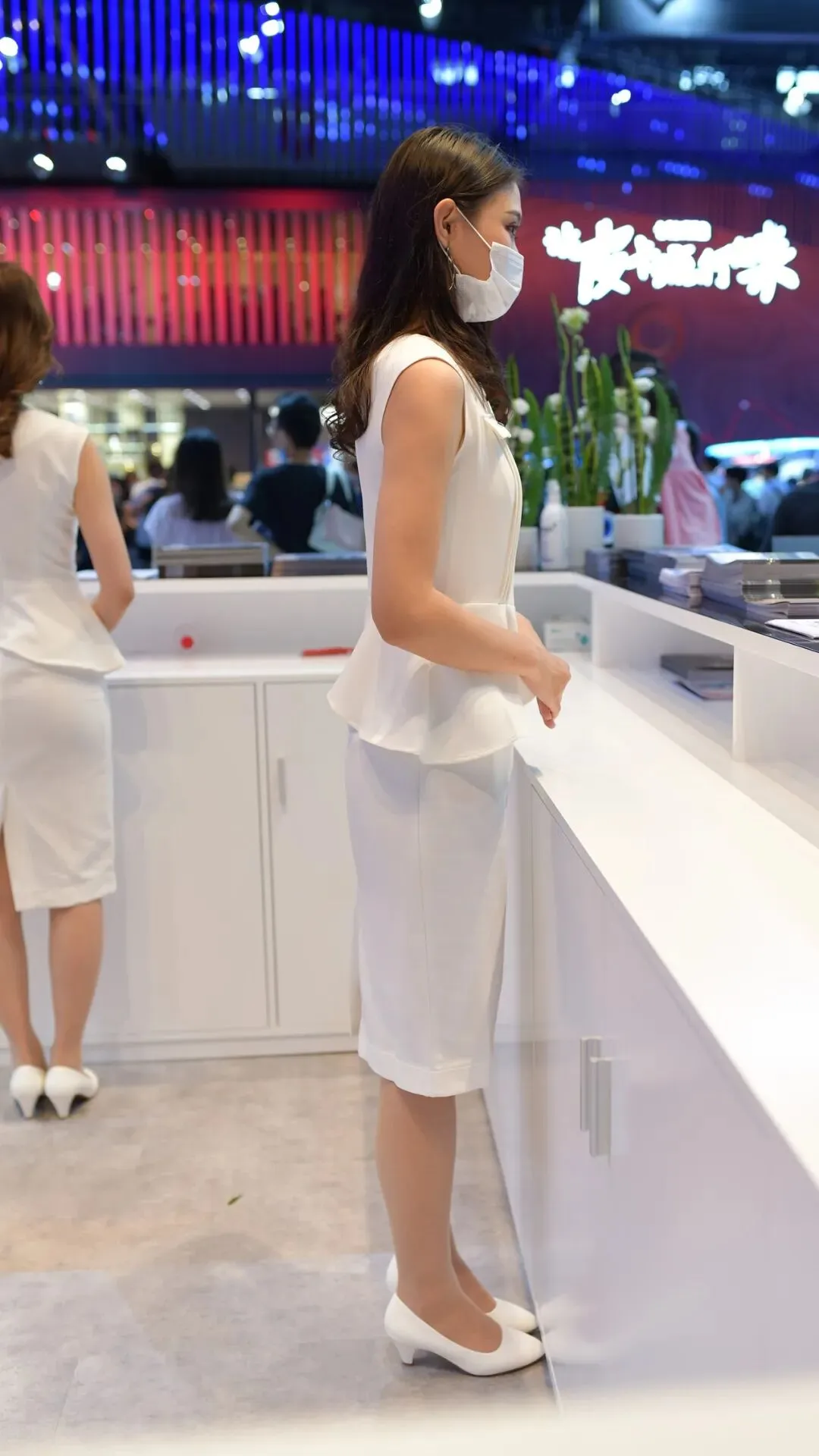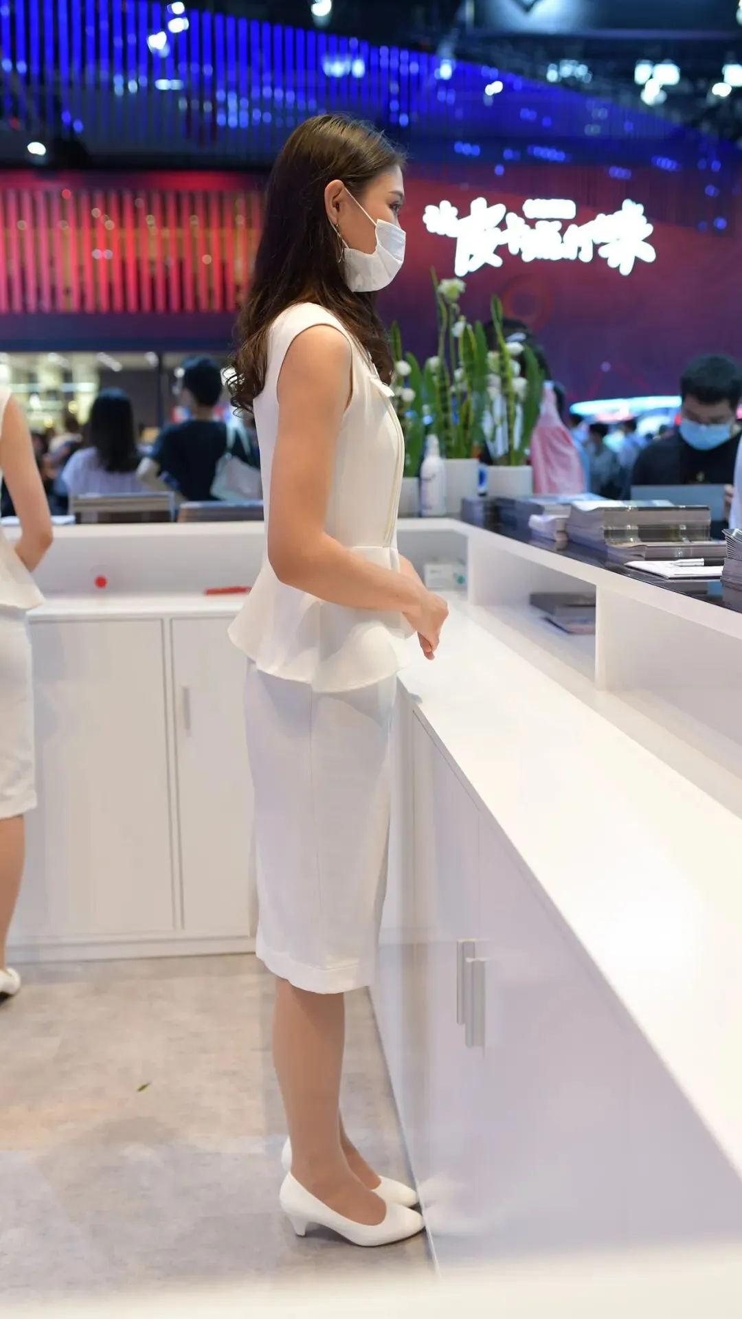 工作人员身着全白色无袖套装(收腰上衣 + 包臀中裙),上衣带有荷叶边装饰,搭配同色系低跟鞋,着装统一且风格简约优雅,是展会 “统一制式 + 舒适得体” 的典型搭配,既契合服务场景的专业感,也兼顾了长时间工作的实用性。