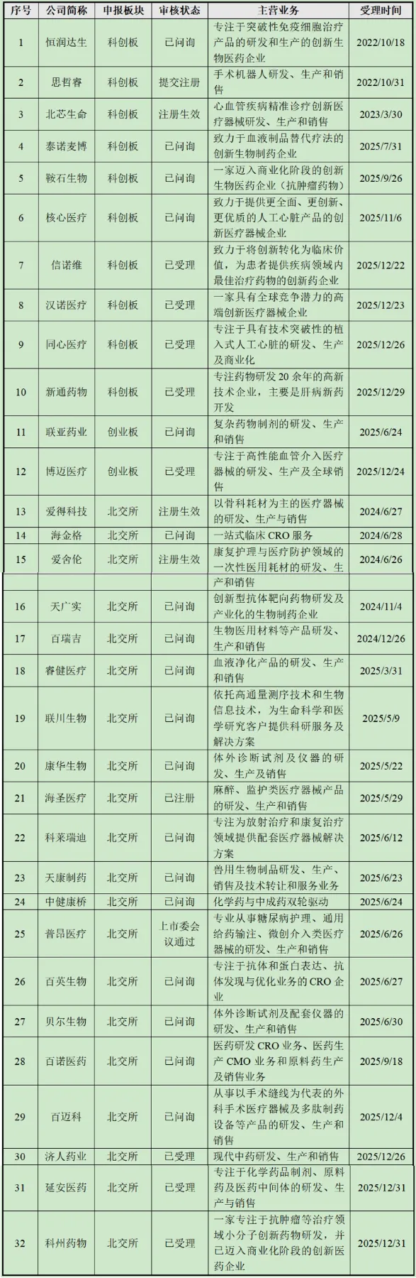 截至2025年12月末,沪深北三大交易所共有32家药企处于IPO在审状态,覆盖创新药、医疗器械、CRO、仿制药等多个细分领域,具体信息如下表所示:
