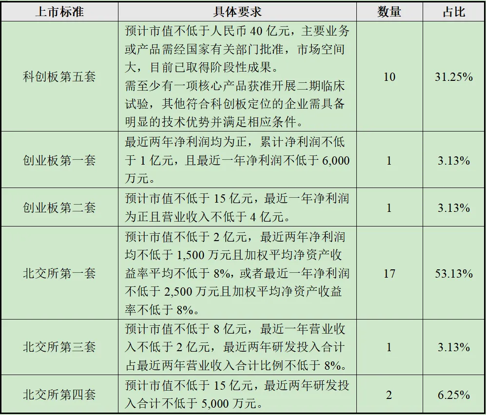 32家在审药企适用的上市标准分布如下: