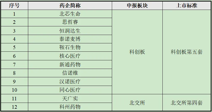 (2)北交所已成为未盈利创新药企业的重要备选通道,2 家药企选择申报北交所并适用第四套标准,对于暂未达到科创板要求的未盈利创新药企而言,北交所提供了务实的差异化选择。