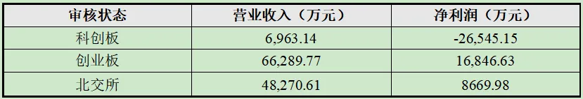 (3)北交所在审药企平均营业收入48,270.61万元,平均净利润8,669.98万元,业绩规模介于科创板与创业板之间,既满足中小药企的实际经营现状,也与北交所服务创新型中小企业的定位相匹配。
