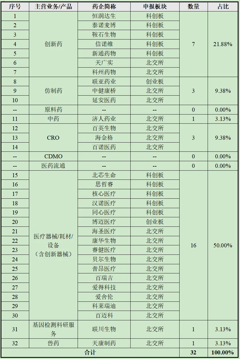 (1)北交所成为药企IPO的核心通道,以20家的数量占比62.50%,凭借对中小药企的包容性,吸引了不少医疗器械、创新药、仿制药、中药、CRO等细分领域药企申报;