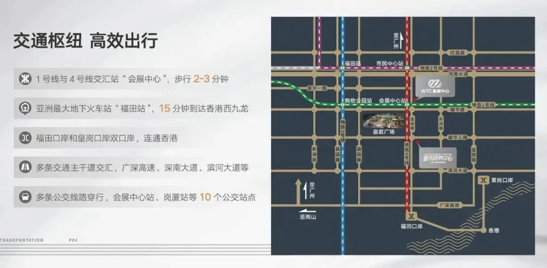 多条交通主干道交汇,广深高速、深南大道、滨河大道等;多条公交线路穿行,会展中心站、岗厦站等10个公交站点。