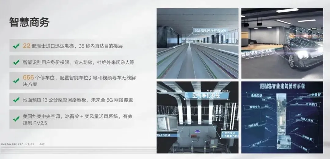 电梯、智能身份识别、充裕停车位、地面架空网络地板、美国约克中央空调尽显智慧商务。