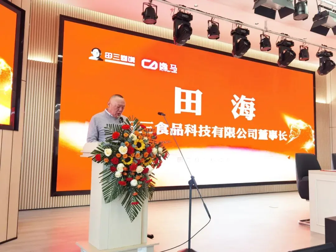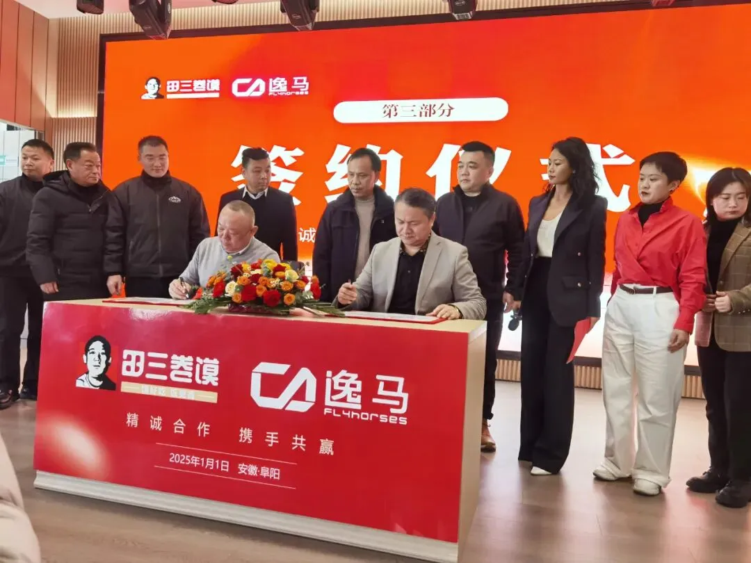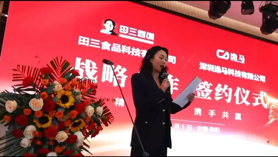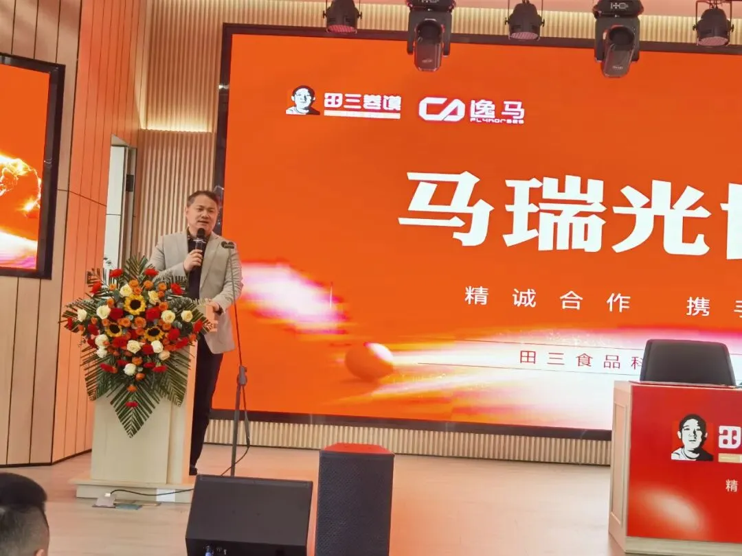 签约仪式现场气氛热烈而庄重。在各方嘉宾的共同见证下,逸马连锁产业集团代表马瑞光与田三食品科技有限公司代表田海分别在合作协议上郑重签字,标志着双方正式建立起紧密的战略合作伙伴关系。