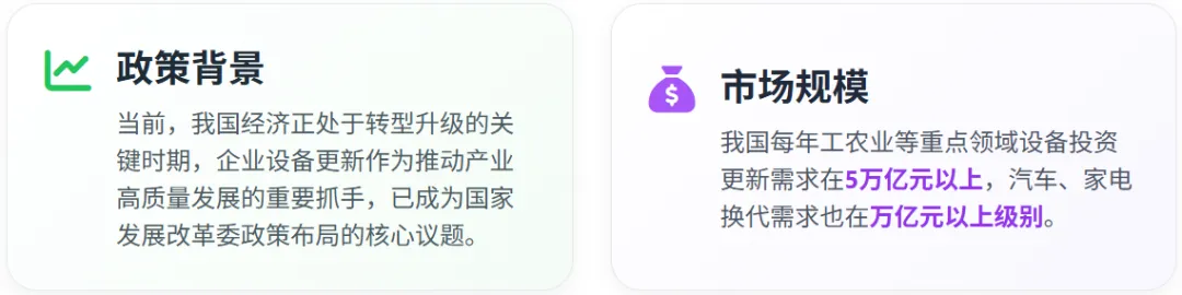 设备更新政策的出台背景具有深刻的时代意义。面对全球产业链重构和新一轮科技革命,我国传统产业亟需通过设备更新实现数字化转型、智能化升级和绿色化发展。同时,在经济下行压力加大的背景下,设备更新成为扩大有效投资、拉动经济增长的重要手段。据测算,我国每年工农业等重点领域设备投资更新需求在5 万亿元以上,汽车、家电换代需求也在万亿元以上级别。这一巨大的市场空间为政策实施提供了广阔舞台。