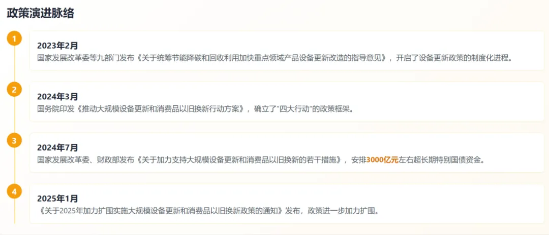 2025 年政策进入加力扩围阶段。1 月发布的《关于 2025 年加力扩围实施大规模设备更新和消费品以旧换新政策的通知》,在继续支持工业、用能设备、能源电力、交通运输、物流、环境基础设施、教育、文旅、医疗、老旧电梯等领域基础上,将支持范围进一步扩展至电子信息、安全生产、设施农业等领域,重点支持高端化、智能化、绿色化设备应用。
