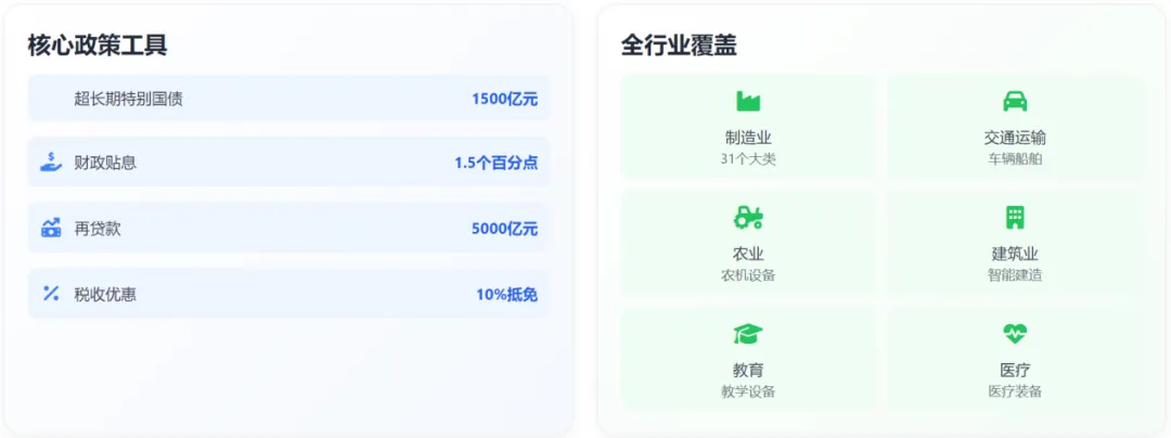 7 月,政策支持力度实现重大突破。国家发展改革委、财政部发布《关于加力支持大规模设备更新和消费品以旧换新的若干措施》,安排3000 亿元左右超长期特别国债资金,其中设备更新资金规模近1500 亿元。这一资金规模的确定,标志着设备更新从政策倡导转向实质性投资拉动。同期,财政部等部门发布《关于实施设备更新贷款财政贴息政策的通知》,将中央财政贴息比例从 1 个百分点提高到1.5 个百分点,贴息期限 2 年,贴息总规模200 亿元。