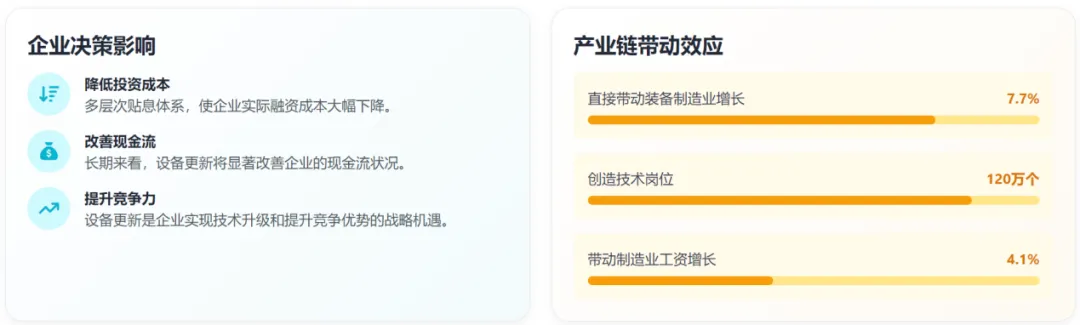 设备更新政策通过多重机制显著降低了企业投资成本,提升了投资回报率。在融资成本降低方面,政策形成了多层次的贴息体系。中央财政贴息 1.5 个百分点,国家发展改革委安排超长期特别国债资金进行额外贴息,地方政府如江苏省再给予 1 个百分点贴息,甘肃省对 "专精特新" 企业设备更新的租赁利息给予 **50%** 补贴。这种叠加式的贴息政策,使企业实际融资成本大幅下降。