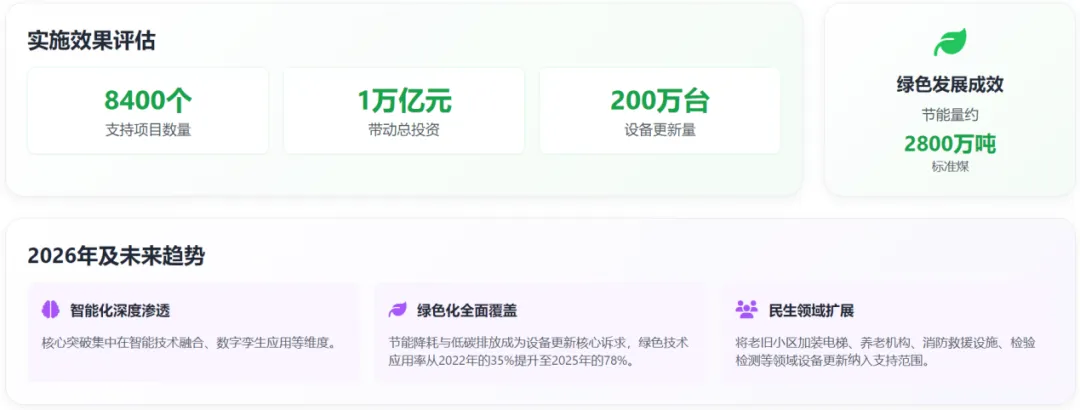 展望 2026 年及未来,设备更新政策将呈现新的发展趋势和重点方向。从政策导向看,"智改"" 智转 ""智绿" 已成为设备更新的鲜明特征。以 "三智" 为驱动力,我国各类生产设备持续向高端化、智能化、绿色化转型升级,不仅撬动了万亿级投资市场,更成为发展新质生产力、打造现代化产业体系的核心引擎。