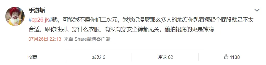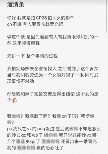 起因是在当天CP26上一位身着JK制服的女生趴在地上摆出各种pose,引来不少摄影师拍摄,而画面外一位女生愤怒指出这种动作行为不合适,质问:保安在哪里啊?并称不要再给JK抹黑了。