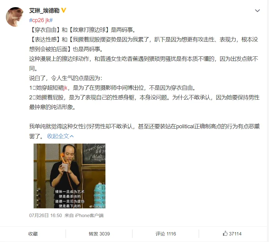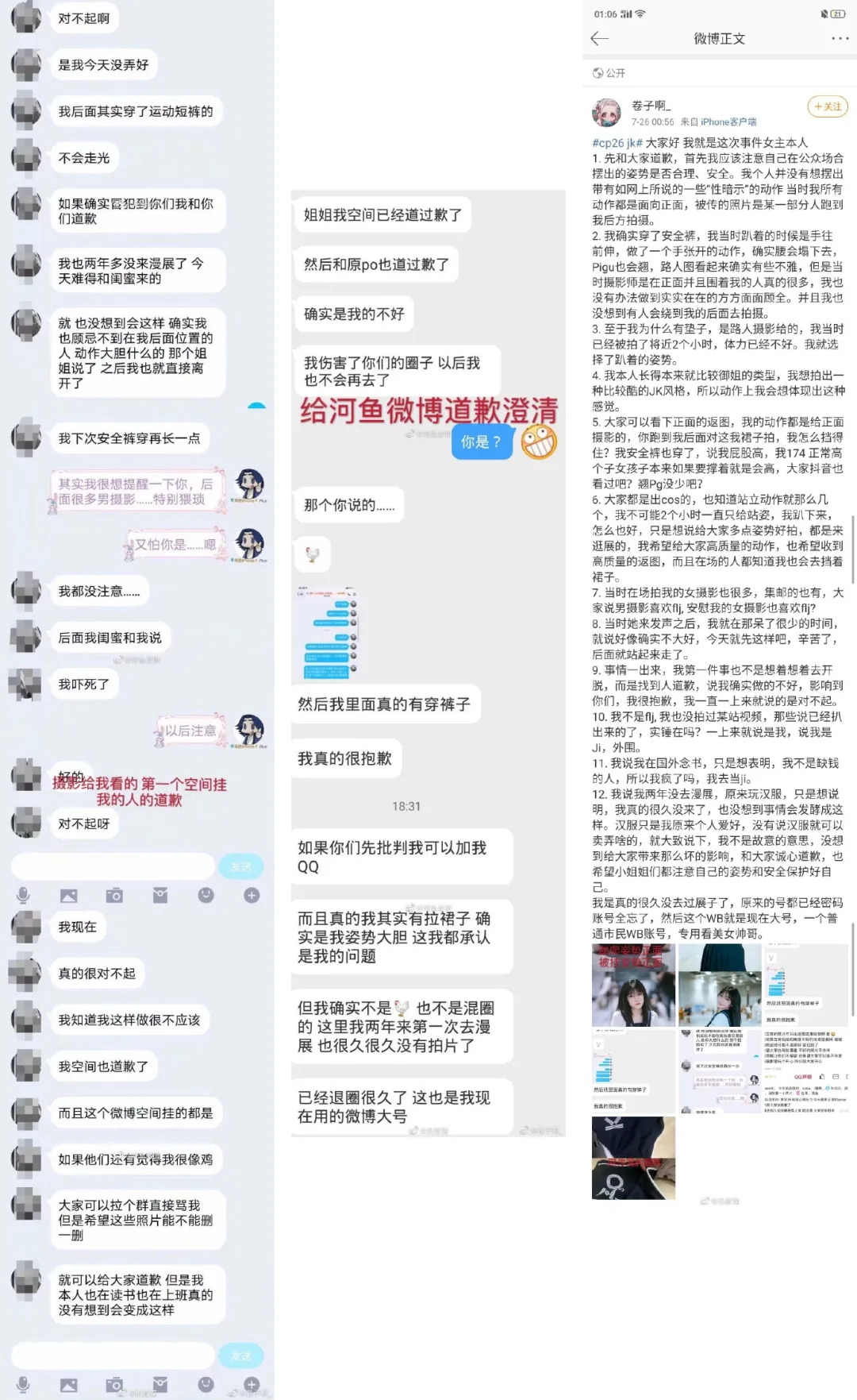 之后当事JK女孩也于26日凌晨发文,称自己穿了安全裤,但是没能注意到自己在公众场合摆出的姿势是否合理,她要为此向广大网友致歉。