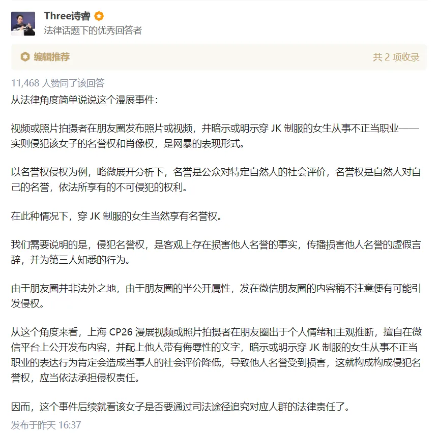 也有网友认为拍照女生的行为才是不对的,将他人的照片视频发布在自己朋友圈,并且无端指责该女生从事不正当职业,触犯了当事人的的名誉权和肖像权。