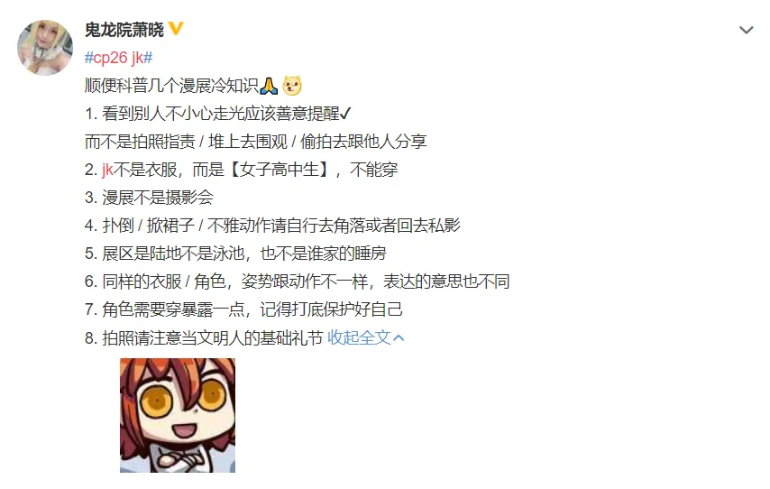 至于这件事情后续会如何发展,到底谁对谁错,这些我们都不得而知,不过在漫展等场合上该做什么不该做什么,其实早就已经有了界定的规则。