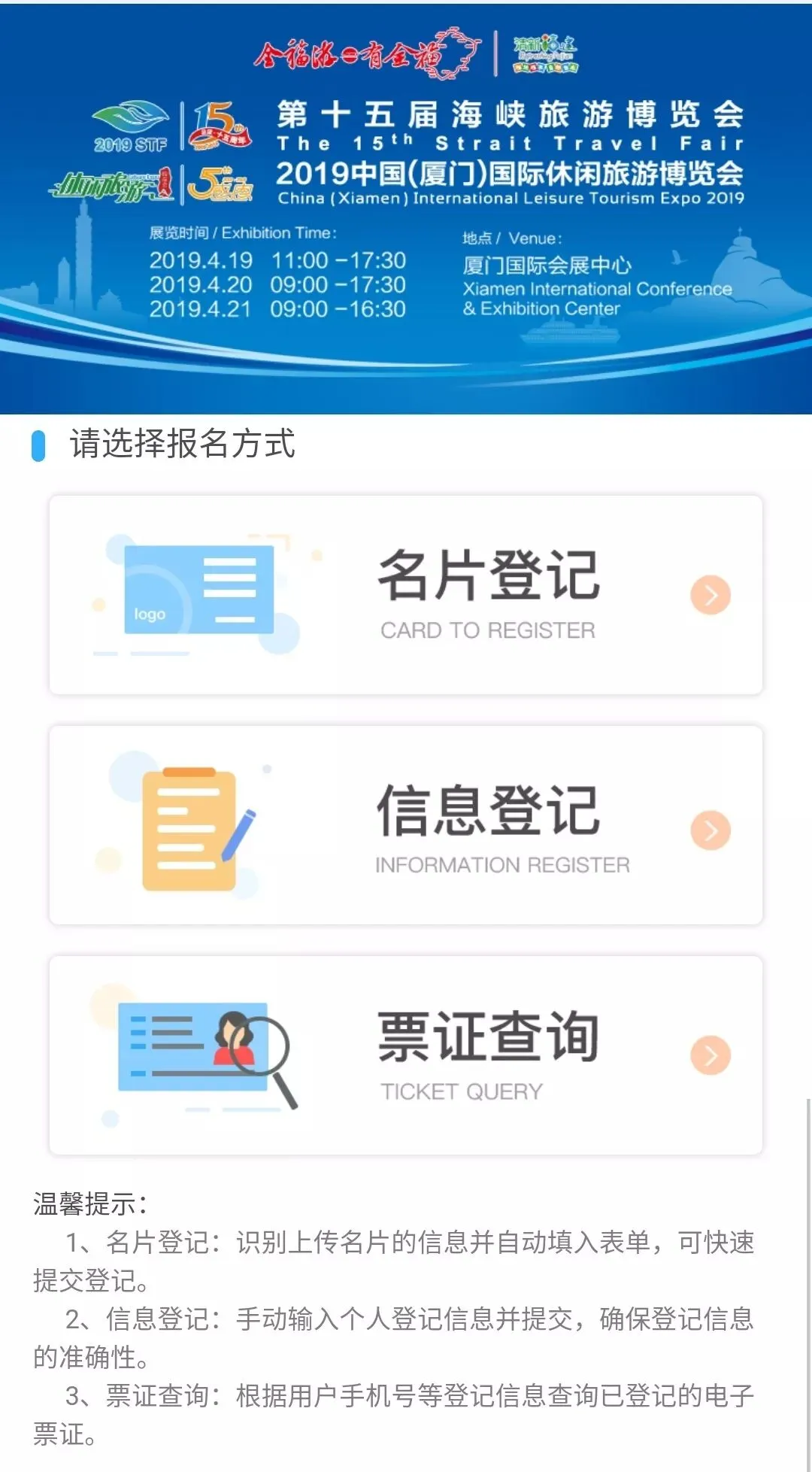 3.旅游从业者可选择“名片登记”入口获取专业观众电子票,市民游客选择“信息登记”入口获取观众电子票;