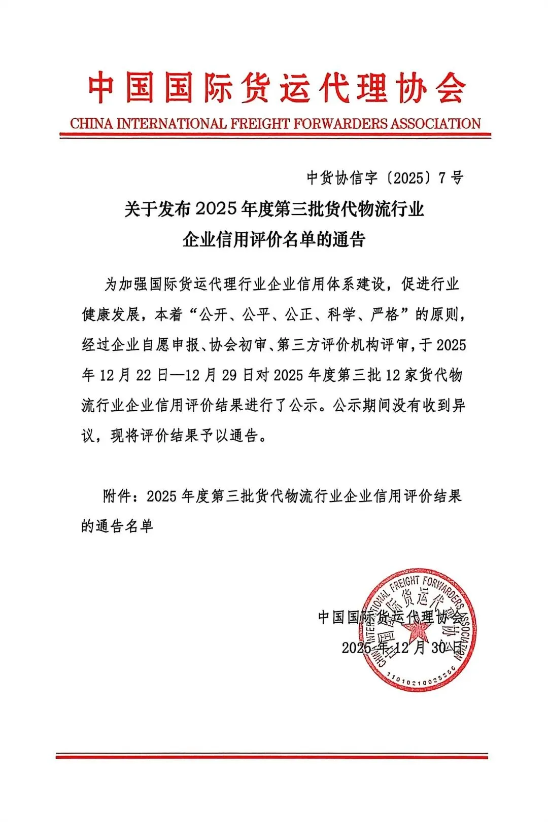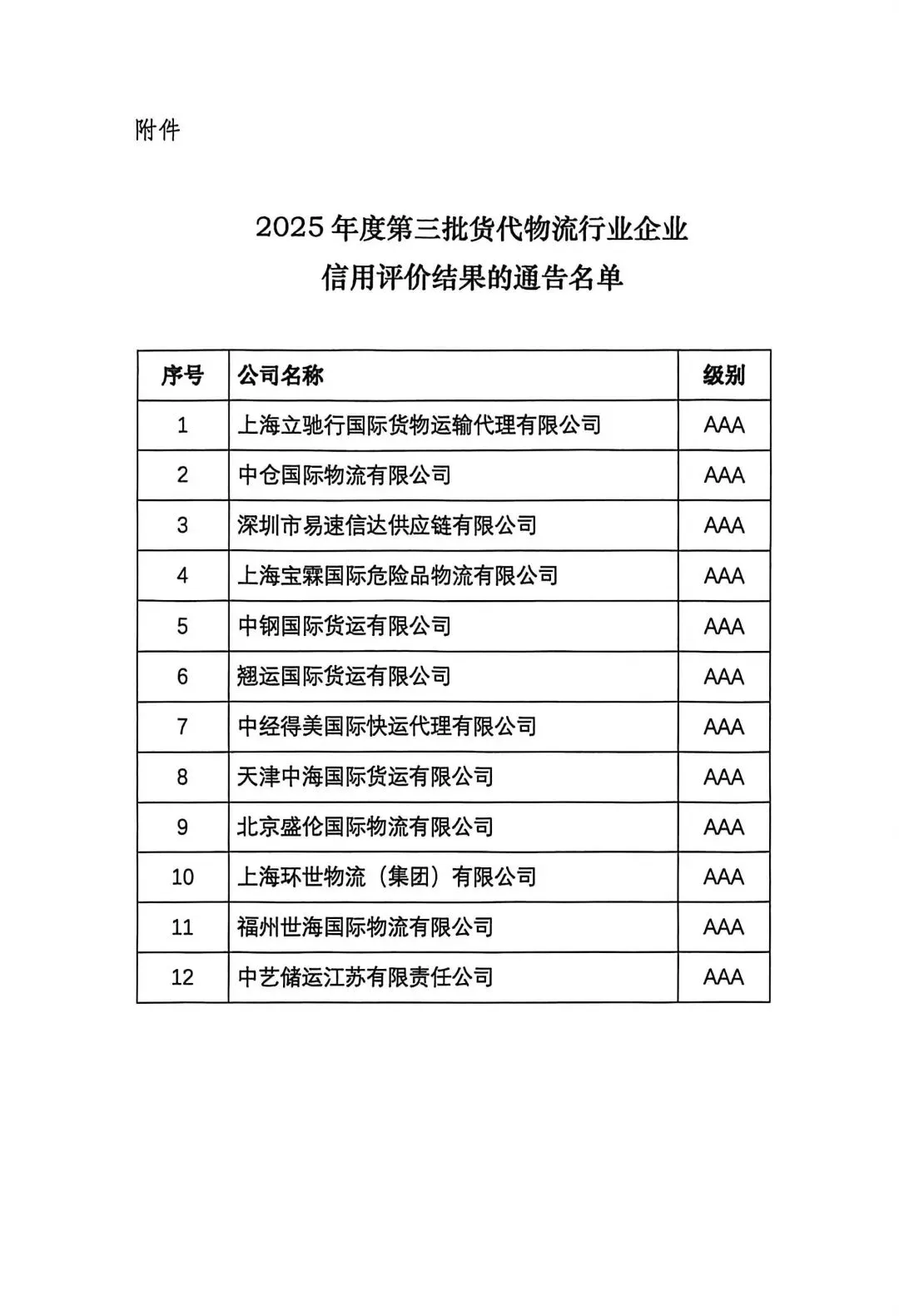 关于发布2025年度第三批货代物流行业企业信用评价名单的通告