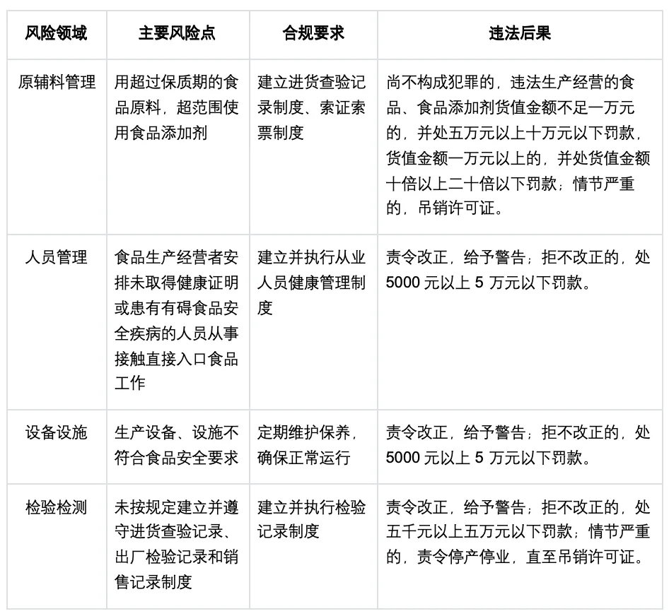表 1:食品生产质量控制主要风险点及合规要求