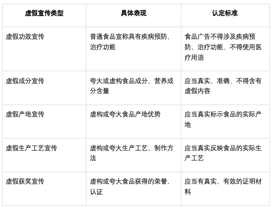 表 3:食品虚假宣传的主要情形及认定标准