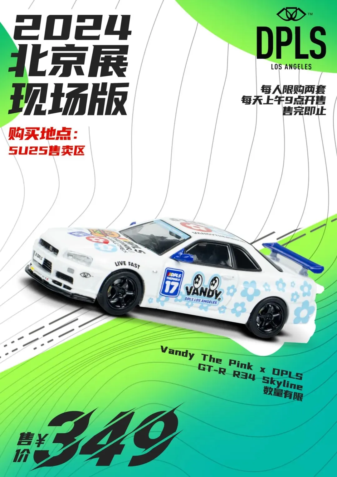 DPLS 为大家带来限量模型 1:64 比例 Vandy The Pink x OPLS GTR R34 Skyline 汽车模型,此款现场版将在北京展 6 号馆限量发售,每人限两台。
