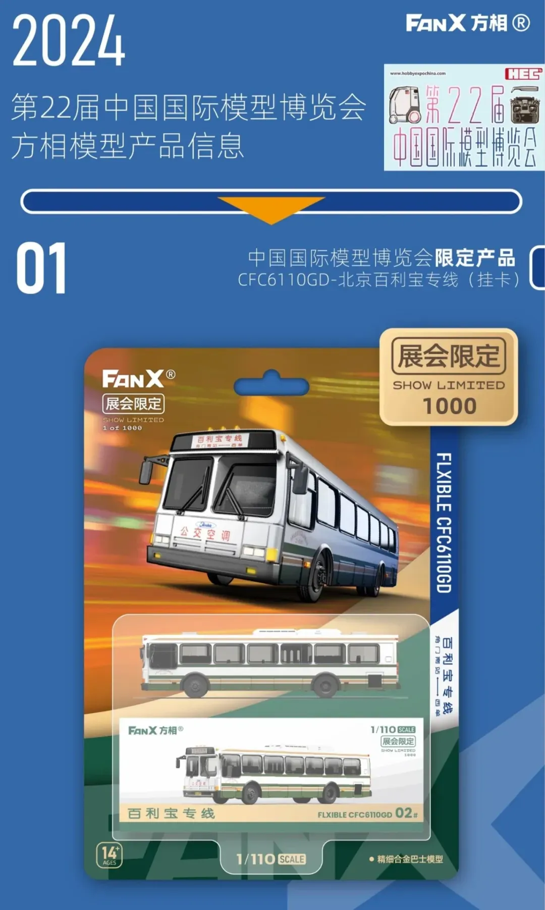 FanX方相作为参展品牌(位于3号馆东南角),此次HEC2024展会限定款为1:110比例模型巴士—CFC6110GD“福莱西宝”:北京百利宝客运“百利宝专线”版本;小车配有展会限定款特殊塑封板卡加纸盒包装,于展览会现场发售。