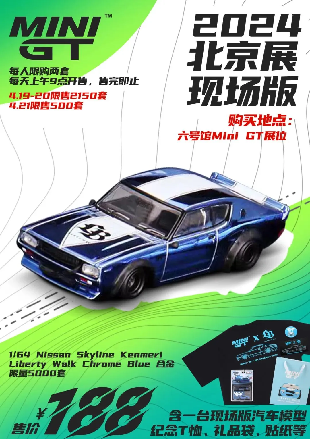 本次 MINI GT 特别为大家推出了现场版 MGT00730 1:64 比例 Nissan Skyline Kenmeri Liberty Walk(Chrome Blue)汽车模型。其套装内容丰富,包括 2024 北京展限定模型一台、MINI GT x Liberty Walk 品牌联名 T恤一件,以及一款精美的展会版礼品袋!套装数量有限,现场发售 5000 套,每人限购两套。