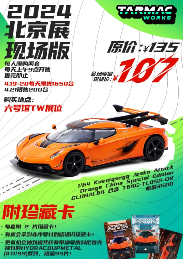Tarmac Works 将在 2024 中国国际模型博览会首发 Trading card 珍藏卡系列产品!套装内含 1:64 合金材质 Koenigsegg Jesko Attack(Orange,T64G-TLO52-OR)汽车模型 + 2 张珍藏卡。限量 3500 套,每人限两套。