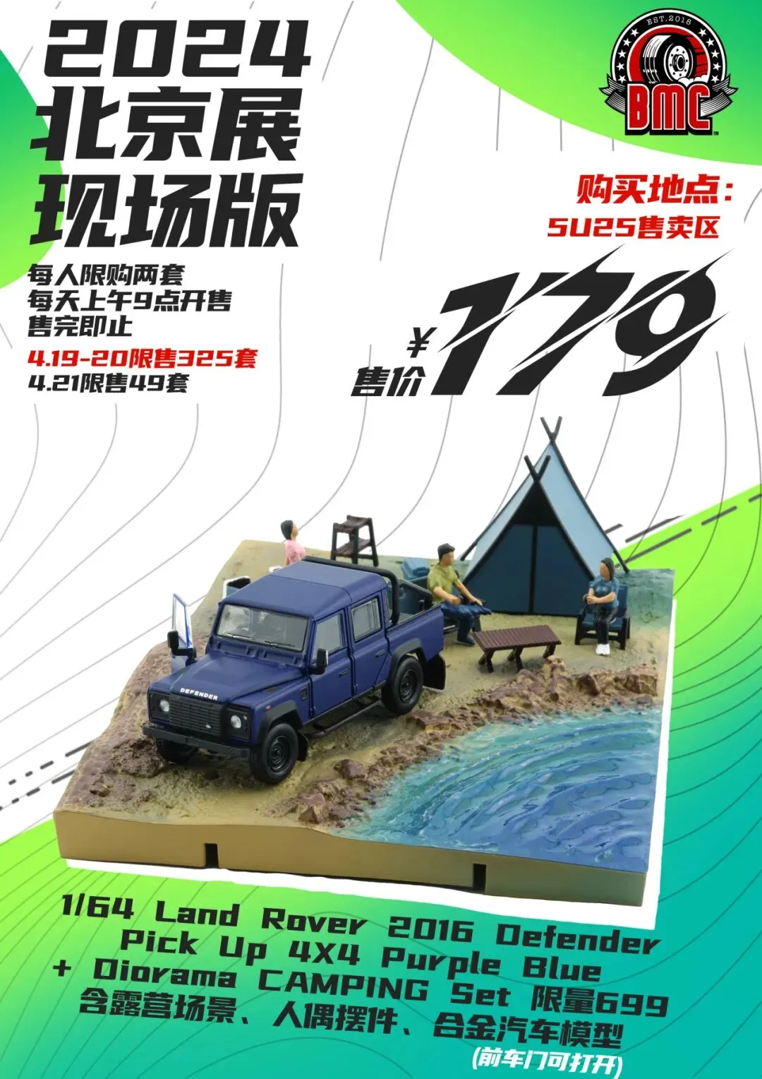 本届北京模型展 BM Creations 为大家带来模型套装1:64 比例 Land Rover 2016 Defender Pick Up 4*4(Purple Blue)with Diorama Camping set 帐篷场景,带你感受野外露营乐趣!此款限定版将在 6 号馆限量发售,仅 699 套,每人限两套。