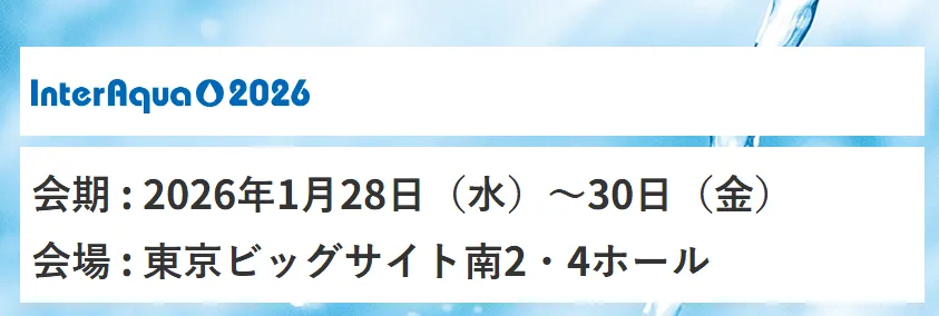 nterAqua2026は、革新的な技術のみならず、今すぐに取り組むことのできる事例まで網羅する、“持続可能な企業活動を支える水ビジネスの展示会”をコンセプトに展示会を開催いたします。今回で第17回目を迎える本展示会は、国内外における水環境の課題解決の場として、市場ニーズの多様化・複雑化に寄り添い、皆様と共に発展してまいります。新しいビジネスの入口として、継続的な企業活動における窓口として、ぜひ当展をご活用ください。