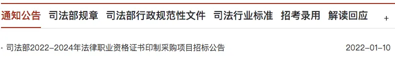 2022年1月10日,司法部网站发布法考证书印制采购项目招标公告,数据显示2022-2024年法律职业资格证书印制采购预算1632.3万元: