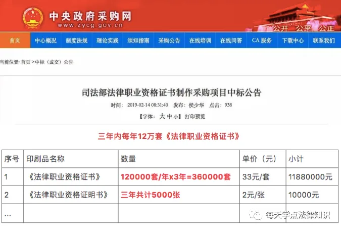 2019年2月中央政府采购网公布了《司法部法律职业资格证书制作采购项目中标公告》,要求供应商三年内每年提供12万套“法律职业资格证书”。从公告中可知当时的证书采购情况:法律职业资格证书单价33元/套,三年内每年12万套,共1188万;《法律职业资格证明书》2元一张,三年共计5000张,共1万元。此次采购的证书后续交付发生过变更,数量不变,服务时间变更为: