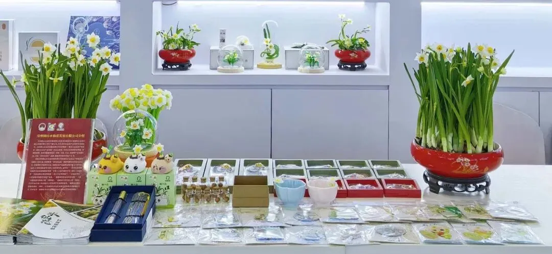 漳州圆山水仙花发展有限公司通过联合漳州棉花画传人、树脂手工匠人,开发了水仙花主题棉花画、树脂仿真花等高端文创礼品;利用水仙花香气,开发水仙花香珠挂件等衍生品;以及时下热门的文创品类。