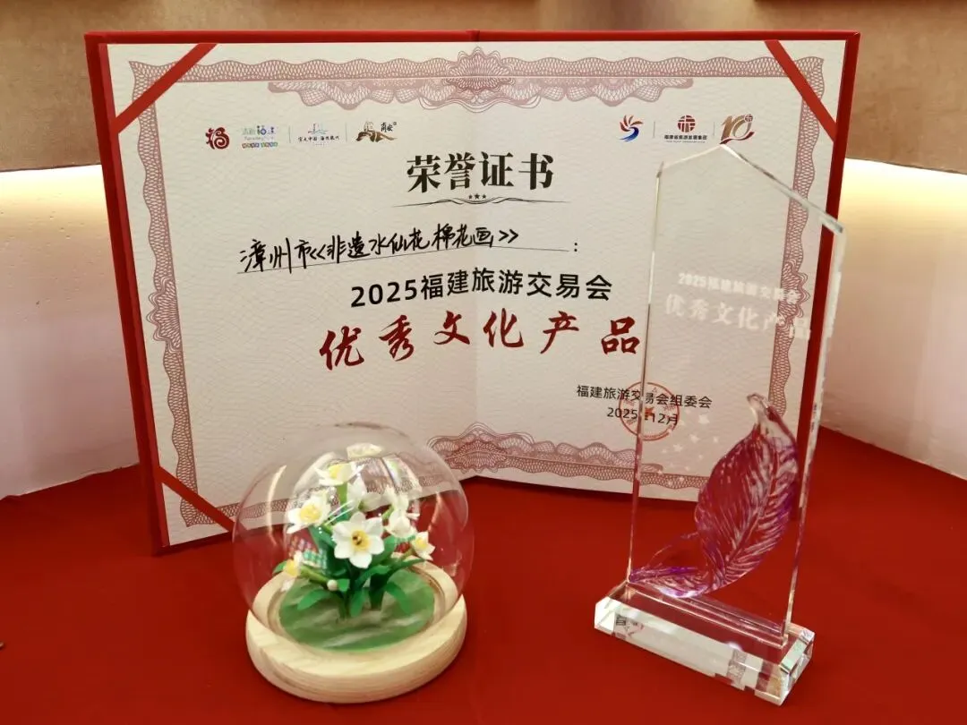其中,水仙花公司结合漳州非遗“棉花画”,推出的“水仙棉花画”产品,凭借其精湛技艺与独特艺术魅力,荣获本届展会“优秀文化产品”奖项,成为闽南文化传承与创新发展的又一亮丽名片。