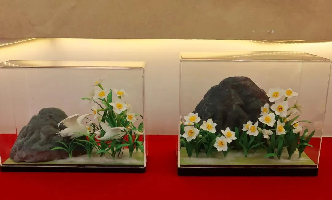 棉花画是漳州地区独创的民间艺术形式,以天然棉花为原料,通过搓、捻、塑、粘等技法,结合水仙花的形态特征与文化寓意,创作出栩栩如生的立体画作。水仙花公司推出的《蝶梦水仙间》《丹色水仙蝶影》《圆山仙影》等作品,既保留了传统棉花画的柔美质感,又融入了漳州水仙花的清雅气质。