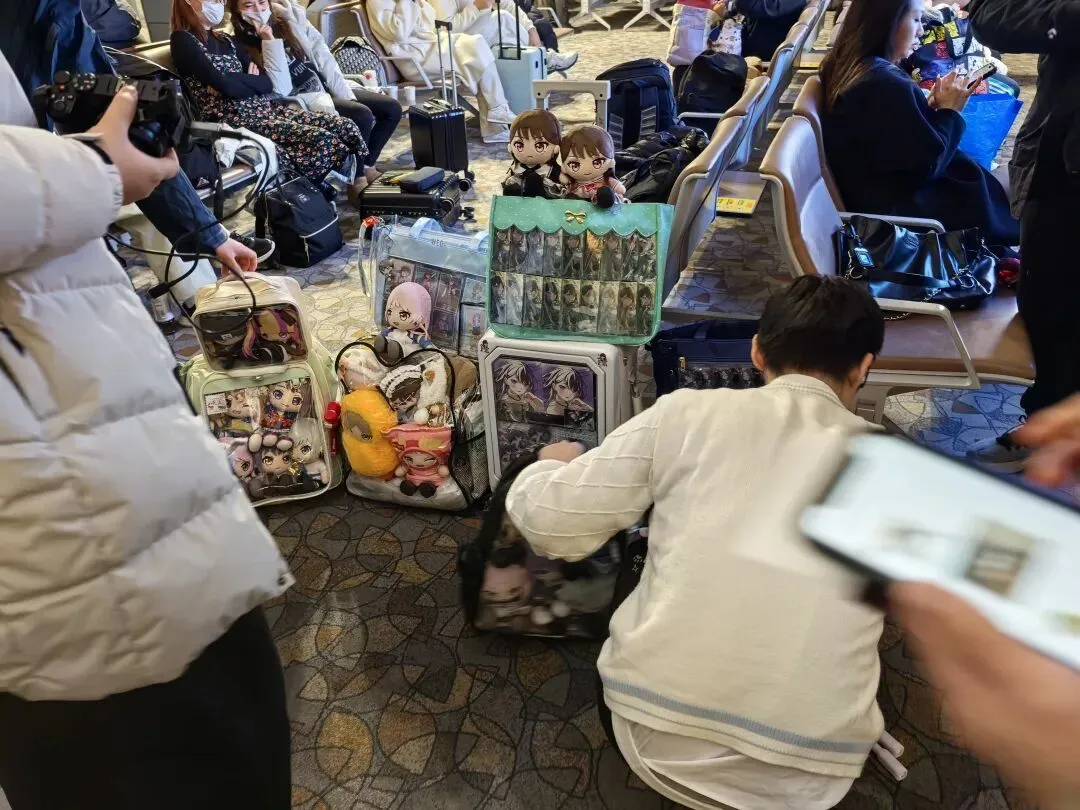 书归正题,经过十一月的蛰伏和种种事端后。顶住各方压力,时隔数月,12月月初,再次出征。刚刚出发,就状况频频,同行的另一组朋友居然有人没买飞机票,所幸,还有余票,遂斥巨资紧急购买。不由得感叹,已被羊宫菲娜冲昏了头脑。到达登机口,眼前的一幕堪称壮观。休息区的空地上,痛包和玩偶已经摆阵完毕,仿佛斜角仪式的现场,散发出一阵阵诡异的光芒。不由得感叹,虽然有不少人因不可抗力未能成行,但Mygo在中国的动员力依然惊人。仔细想来,这周同时集齐了Mygo,Gbc和莲之空,三者叠加,在中国有如此动员力也好像意料之中。总之,在喧嚣中,MM877顺利起飞。