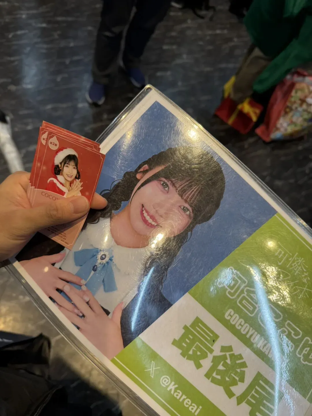 当天晚上是可怜的圣诞活动,地方有些偏,到达横滨后还需要坐很长一段的地铁。会场在一个商场顶楼,有些难找。会场规模也很小,就像是一个小型的会议室,都没有学校的阶梯教室大。圣诞活动是歌曲和游戏结合的形式,开场ccy就下来给我递了糖果,因为我不在过道,她还是把手伸进来给我的,太可爱了。虽然歌并不多,但包含了チームメイト和夢ファンファーレ这种高质量的选曲。第一个游戏环节猜谜也有点意思,可以让全场观众都参与进来。终演后的特典会,居然nns和akr的券都卖光了,每次来都要看看nns,毕竟是我在可怜切的第一个人,今天居然没有券,有点令我意外,不过她今天有点小盐我,那就算了。Akr刚刚宣布了明年毕业,毕竟也是团队的一份子,也想留个念想。有些倒霉的是,我每次来看可怜的Live,橘美空都不在,难道就这么没有缘分吗?我除了惯例去切了ccy之外,还去找了yura,她唱歌真是一绝,人特别讲礼貌,一直在向我鞠躬。本着好不容易来一次的心态,把能找的成员基本都找了一次。雨后,天气微冷,在地铁站买了肯德基的圣诞限定套餐和两个甜甜圈,就当是平安夜的庆祝了。