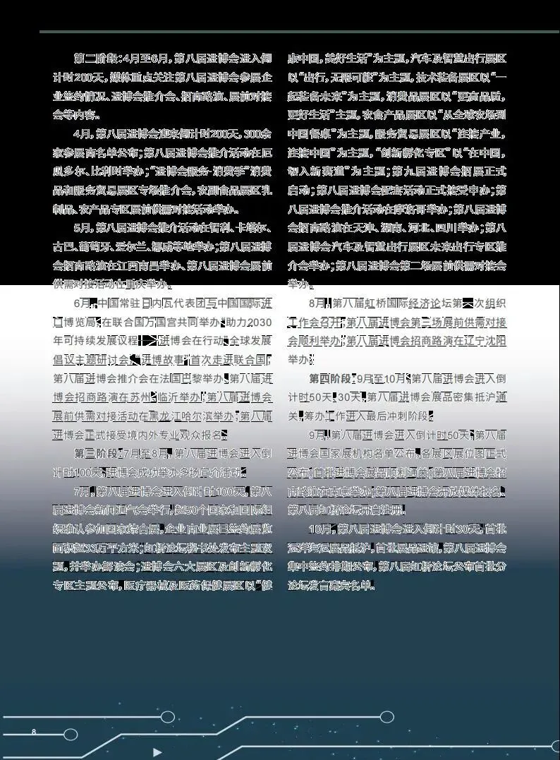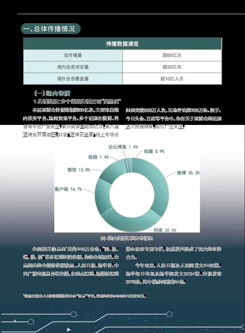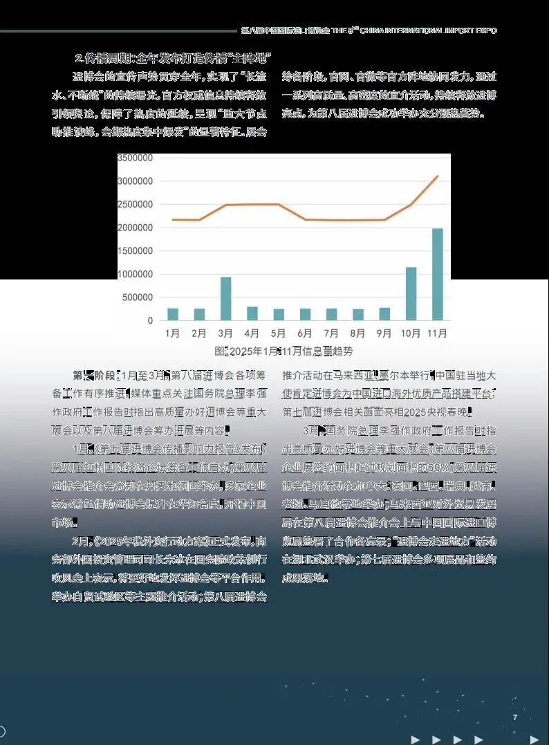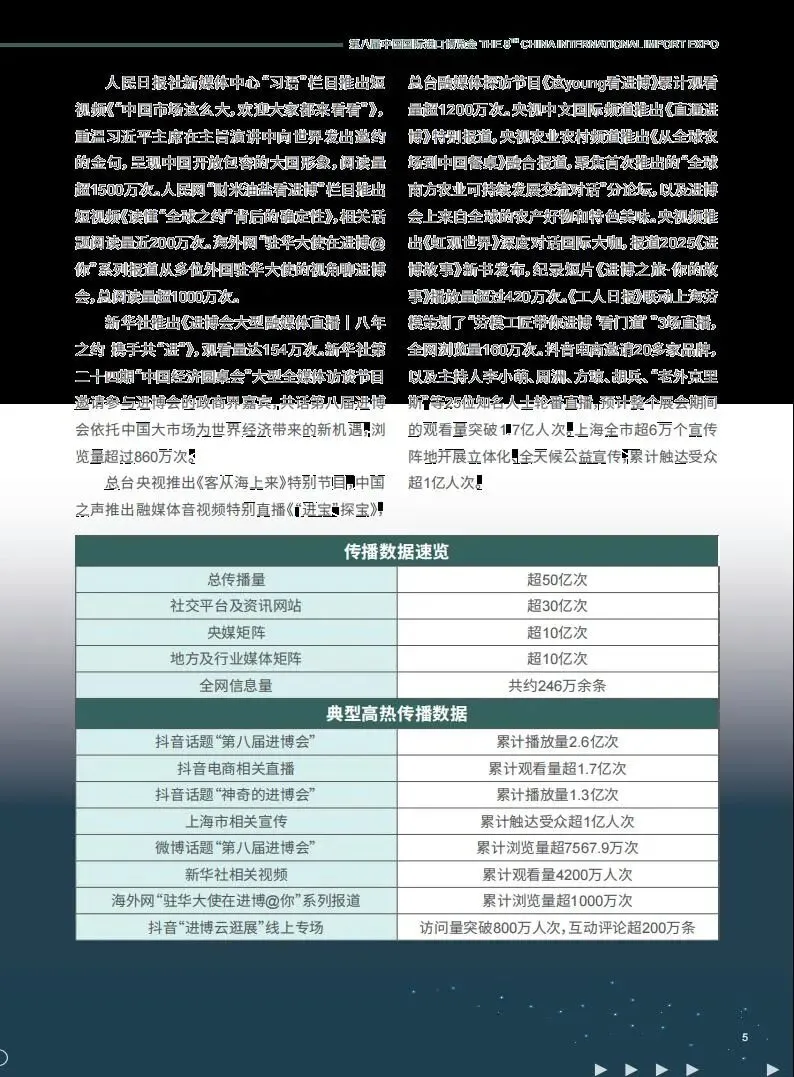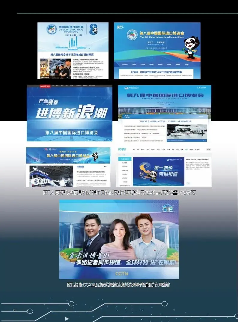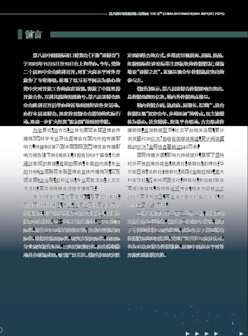 第八届中国国际进口博览会于 2025 年 11 月 5 日至 10 日在上海举办,作为党的二十届四中全会后首场重要经济外交活动,其传播影响力再创新高,总传播量超 60 亿次,境内外亮点纷呈,全方位展现了中国高水平对外开放的坚定决心。