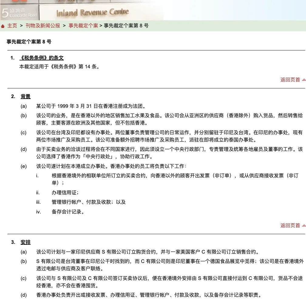 本案例中,香港公司作为一个中央行政部门,协助行政工作。供应商 S 有限公司及客户 C 有限公司均是由境外派驻人员在境外找到,货品亦不经过香港。
