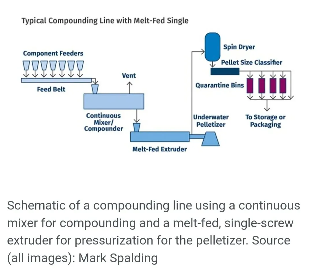 一些共混改性生产线采用双螺杆挤出机或连续混炼机进行配混操作,随后连接一台熔体喂料的单螺杆挤出机为造粒提供物料增压。图1的示意图展示了一种典型配置。