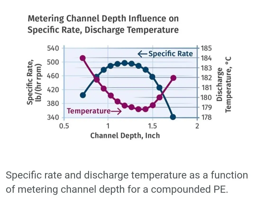 如前所述,螺杆螺槽中存在一个施加的正轴向压力梯度。这是因为进入进料段的物料压力为零,而由于切粒机的要求,排出压力相对较高。这个压力梯度降低了挤出机的比速率。此外,比速率随计量段螺槽深度的立方关系减小。这就是为什么比速率在螺槽深度约1.18英寸处达到最大值。