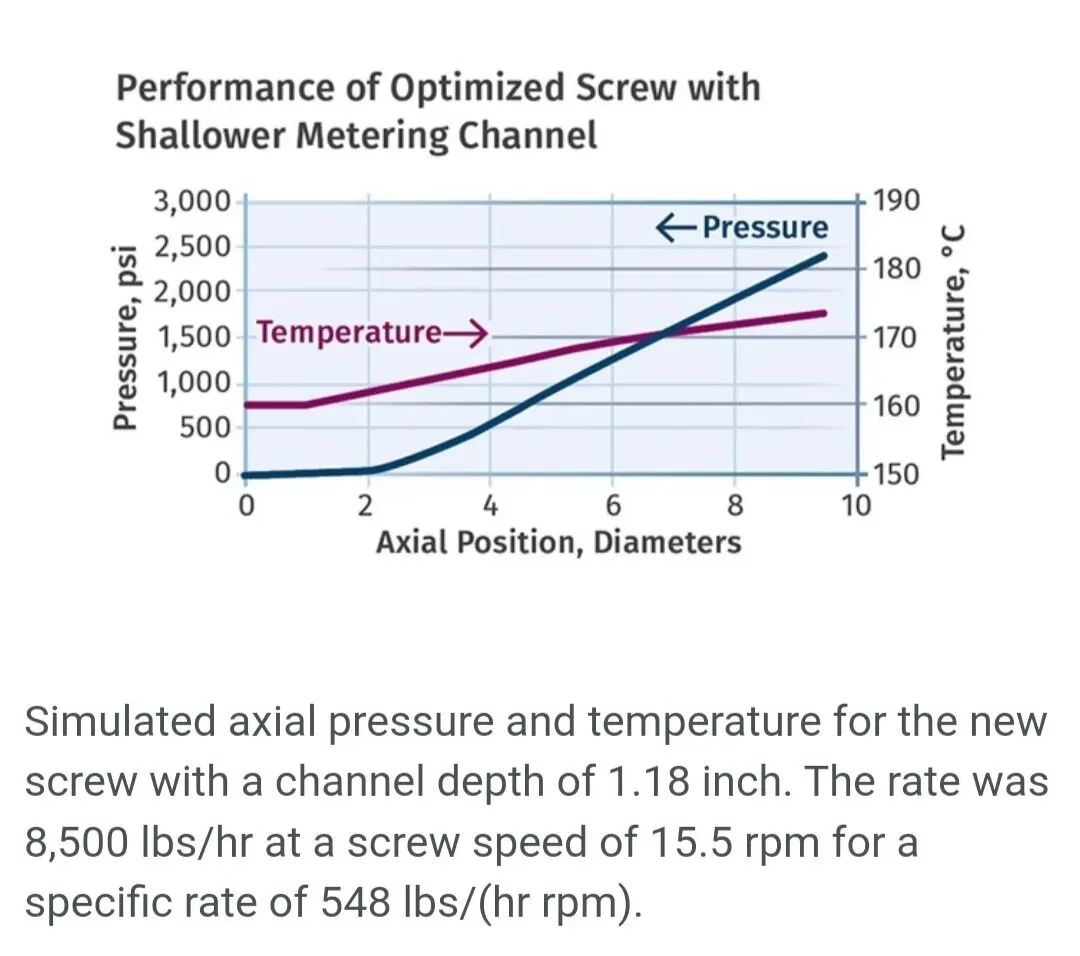 随后,制作了一根新的螺杆,其计量段螺槽深度较浅,为最佳深度1.18英寸。图3展示了该螺杆设计的轴向压力和温度分布模拟结果。模拟表明,新螺杆应能在螺杆转速15.5转/分钟下泵送8,500磅/小时,比速率为548磅/(小时·转/分钟)。这个速率是原螺杆速率的2.5倍以上。