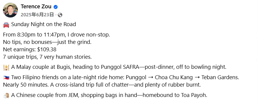 邹俊杰在脸书上发文记录了他当网约车司机的日常,去年6月的一个周日夜晚,邹俊杰从8点半工作到近午夜。三小时内完成七单,总收入109.38新元,时薪约36.46新元。亮眼数字的另一面是:他行驶了近120公里,每公里收入约0.91新元。