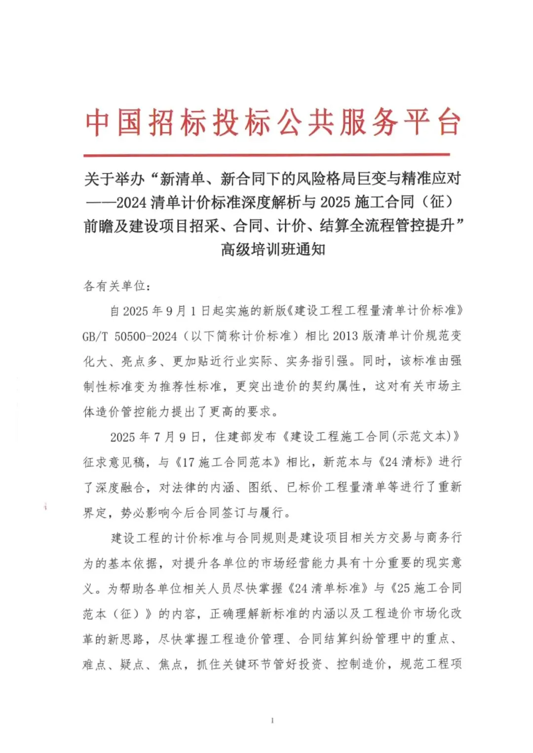 关于举办“新清单、新合同下的风险格局巨变与精准应对--2024清单计价标准深度解析与2025施工合同(征)前瞻及建设项目招采、合同、计价、结算全流程管控提升高级培训班通知