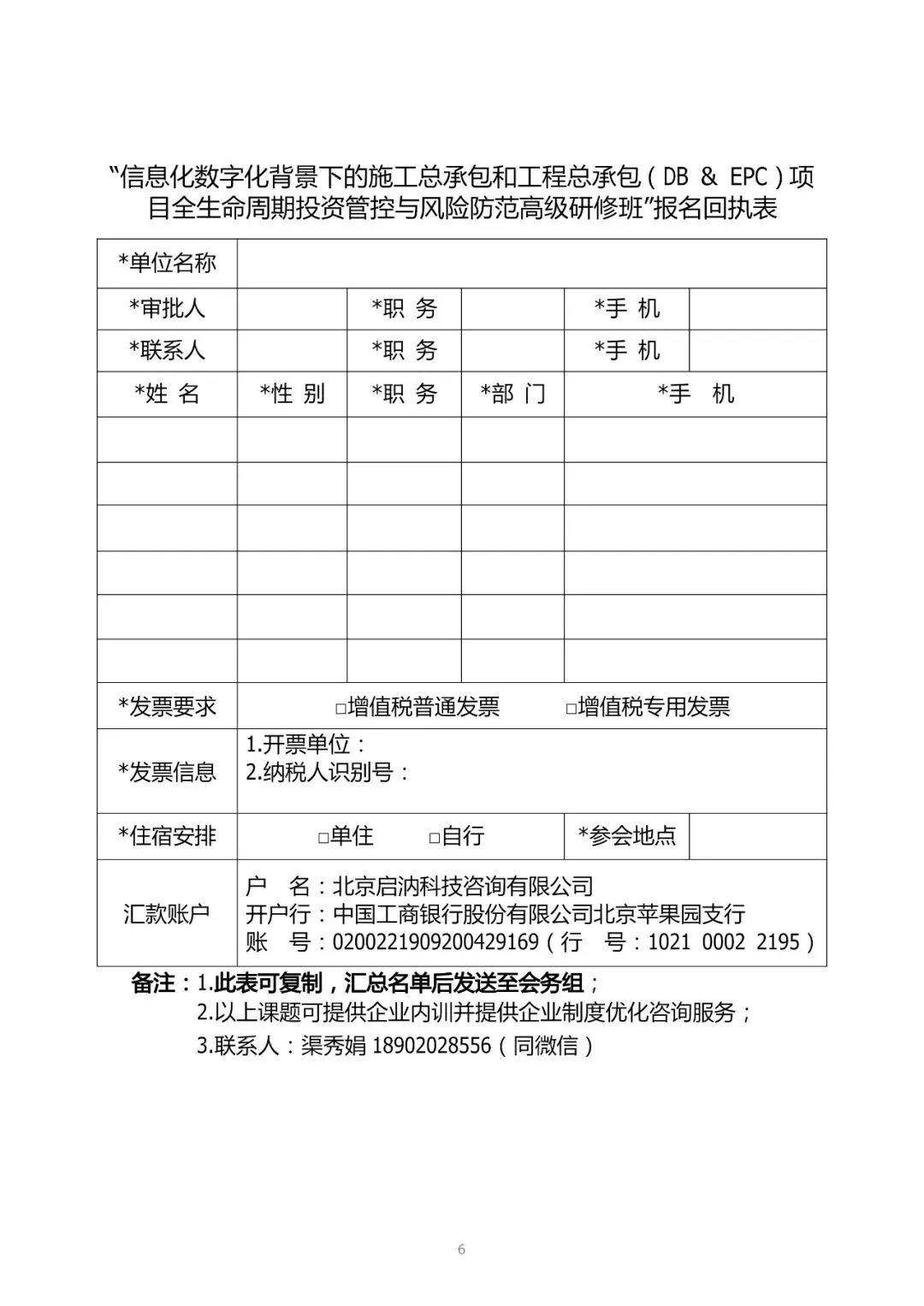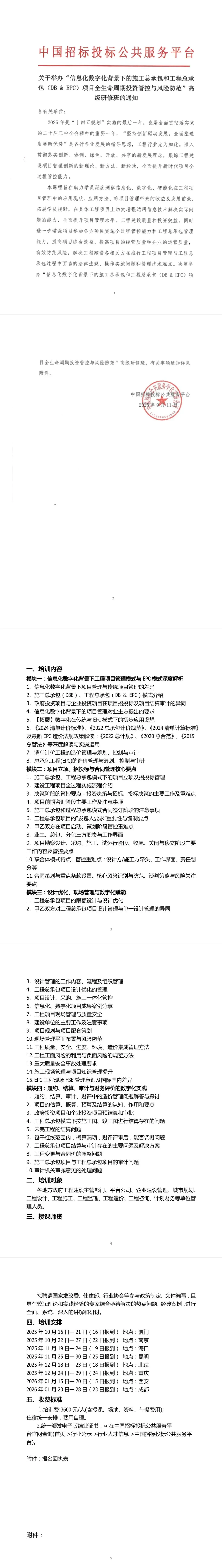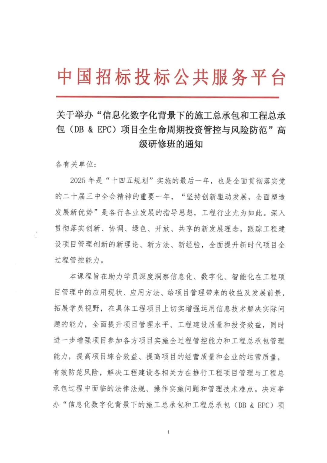 关于举办“信息化数字化背景下的施工总承包和工程总承包(DB&EPC)项目全生命周期投资管控与风险防范”高级研修班的通知