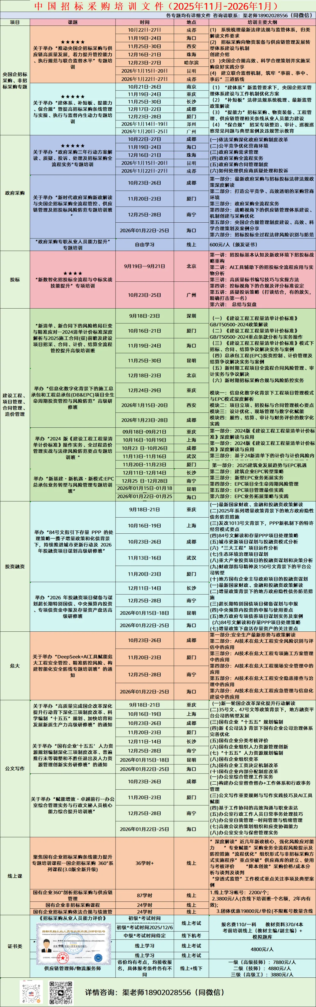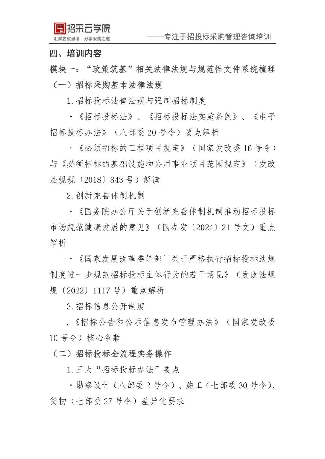 工程行业向精细化管理转变,2024 年住建部发布的《建设工程工程量清单计价标准》等新标准即将实施,相关人员需掌握新管理要点和造价管控方法。 面对这些变化,专业培训成为从业者必然选择。中国招投标公共服务平台联合《中国招标》期刊举办专题培训,邀请权威专家授课,解读政策法规,分享实战经验。培训内容围绕体系建设、流程实操、能力提升、合规监督,通过模拟演练和案例分析,帮助学员掌握核心知识与技能。下面为大家详细介绍具体课程安排。